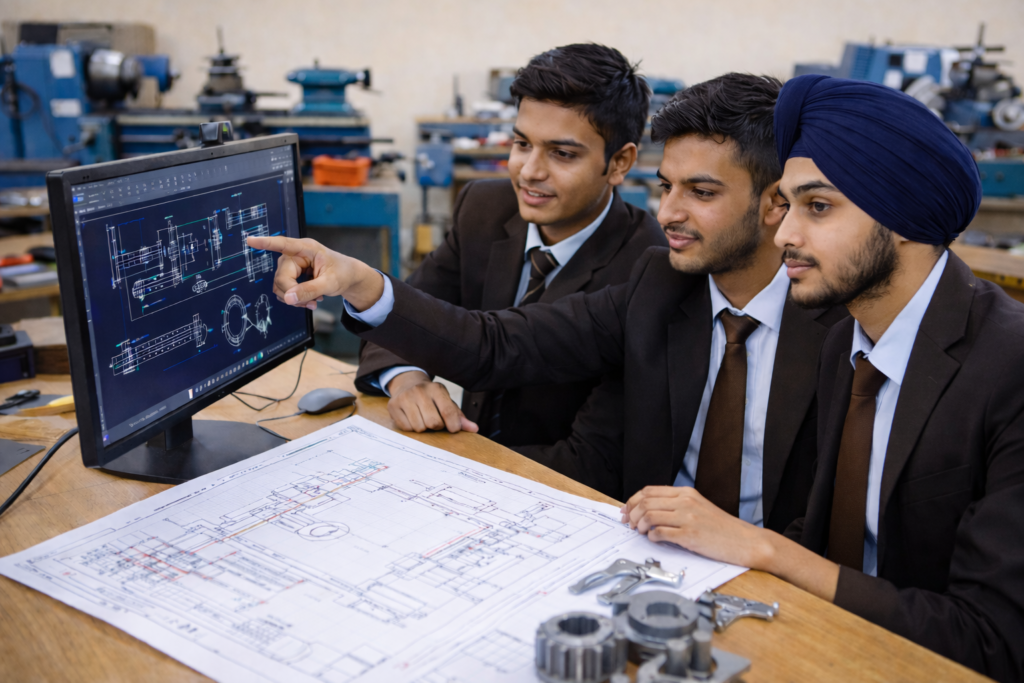 Mechanical students receive training in AutoCAD-based mechanical drafting and industrial design drawings, helping them understand component design and technical documentation. They also gain practical exposure to automation systems and IoT-based motor vehicle technologies through industrial training and project-based learning.