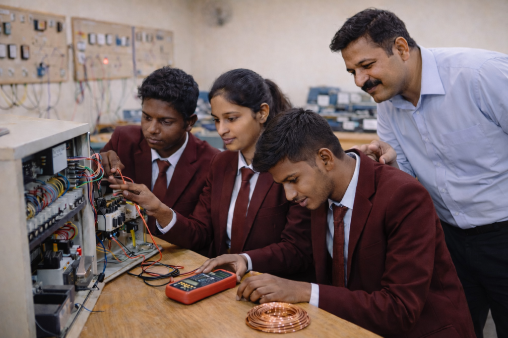 Electrical and Electronics students receive training in house wiring design, industrial wiring systems, and electrical layouts to understand real-world electrical installations. Through industrial training and project-based learning, students also gain practical exposure to estimation and costing, Electrical AutoCAD, PLC, SCADA, MATLAB, and IoT-based applications.